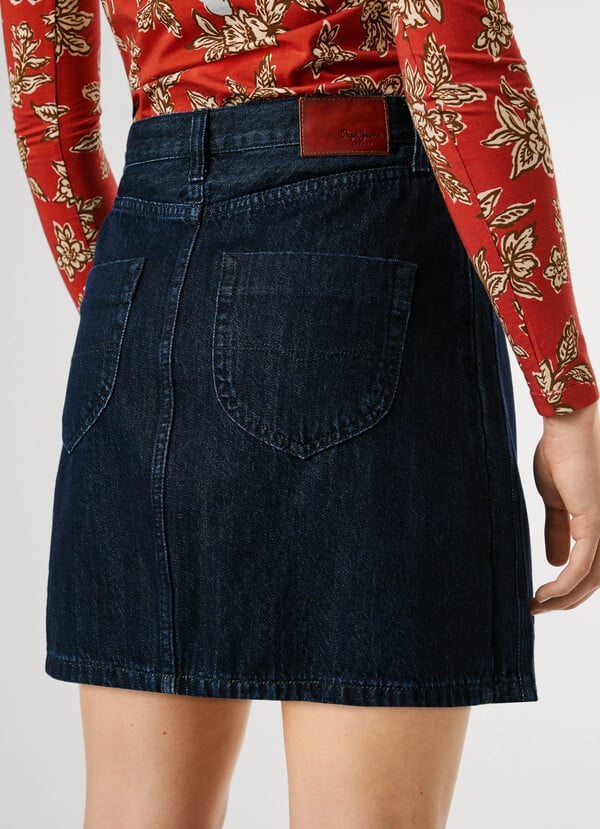 - Falda corta en tejido denim rígido, ideal para cualquier ocasión.