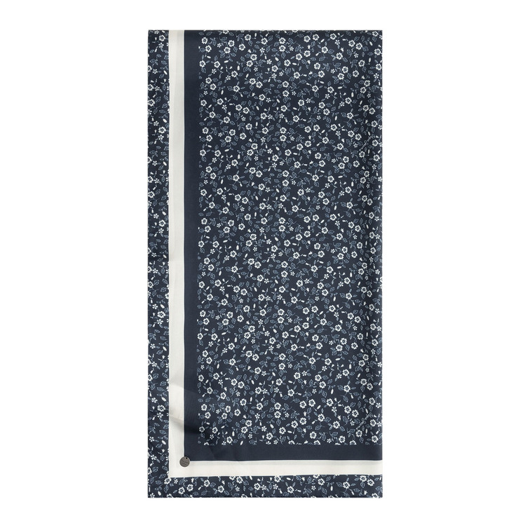 El estampado floral en combinación con el logotipo metálico en un diseño clásico pero contemporáneo convierte a este pañuelo en el complemento ideal, capaz de elevar cualquier atuendo. Es un accesorio imprescindible para cualquier mujer que desee reflejar su gusto por la moda con un toque sutil y refinado.