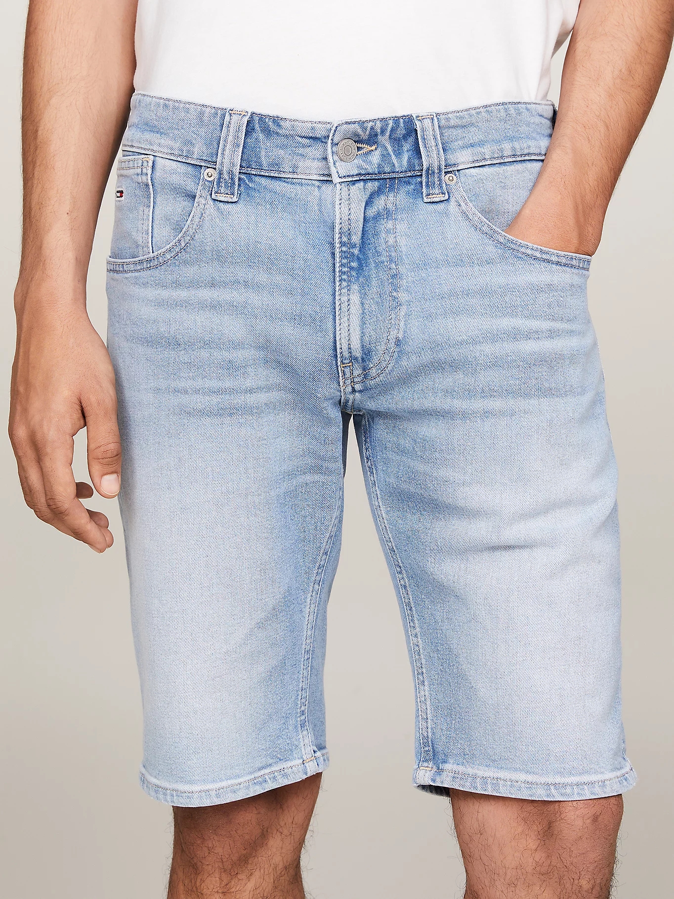 Descubre este moderno y veraniego pantalón vaquero corto de Tommy Jeans, ideal para lucir un look fresco y casual durante la temporada. Fabricado con un tejido denim elástico de algodón de alta calidad, este pantalón presenta un atractivo efecto desteñido en la parte delantera y trasera que le otorga un toque de estilo único.